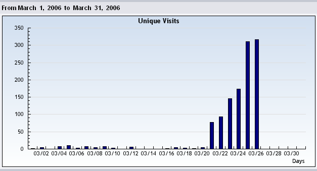 This is a graph of my web site statistics for unique visitors over the past month. I'd like to think that this is all because everybody wants to learn more about which HDTV I'm going to buy. But I'm guessing that it has more to do with David Lenihan calling Condoleezza Rice a coon and the fallout from that.