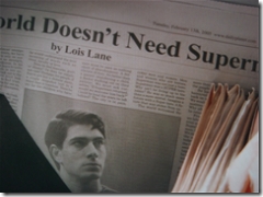At one foot, you can actually see the individual pixels on the LCD display and the black around them (a.k.a. the screen door effect). I can make out some of the article text in the HD DVD, but you can't even read the date/web address in the upper right on the DVD ("Tuesday, February 13th, 2005 www.dailyplanet.com"). Also note the color of the newspaper is more yellow in the DVD and more natural in the HD DVD. Resolution is certainly an important aspect of HD, but the better color reproduction is impressive as well.