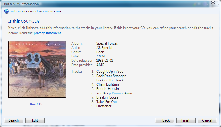 Next it gave me a list of albums by .38 Special and I picked the correct one. The final screen shows you all the details of the album it found. Just click "Finish" and your information will be up to date...right?