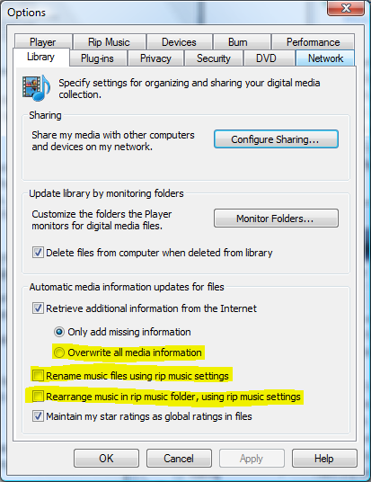 To get WMP to stop changing file names, locations, and song information, I had to disable a few options. These are the options to *avoid*:
