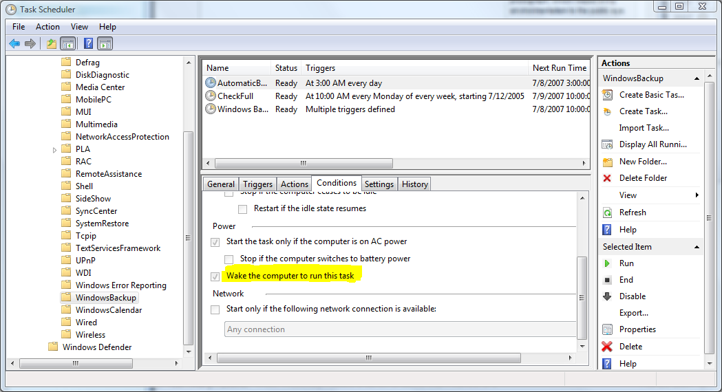 Follow these instructions and your computer can sleep whenever you aren't using it *and* will wake-up to do a backup. This is for Windows Vista only.