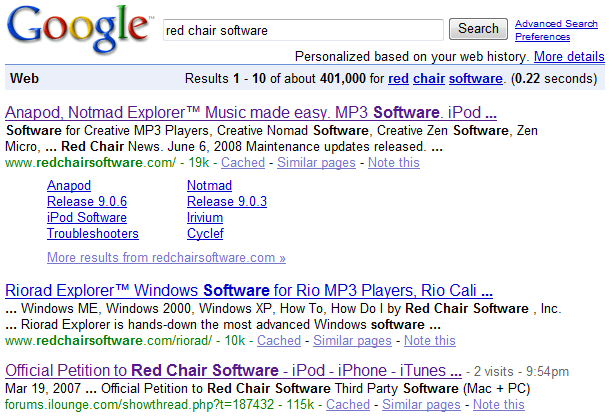 I told PayPal to check Google...everybody is having problems with Red Chair Software. A Google search of "red chair software" provides two links to Red Chair Software's website, followed by a petition from angry iPod users that have been screwed by Red Chair Software. A few more links down is a forum about how unresponsive Red Chair Software is.