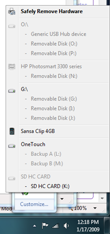 There are a lot of changes with the new taskbar. I’m going to focus on the notification area of the taskbar (the lower right) with this post. The notification area for Windows 7 is pictured above.
