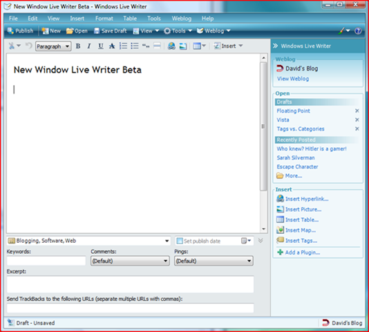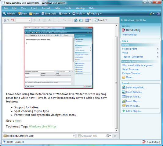 I have been using the beta version of Windows Live Writer to write my blog posts for a while now. I love it. A new beta recently arrived with a few new features: